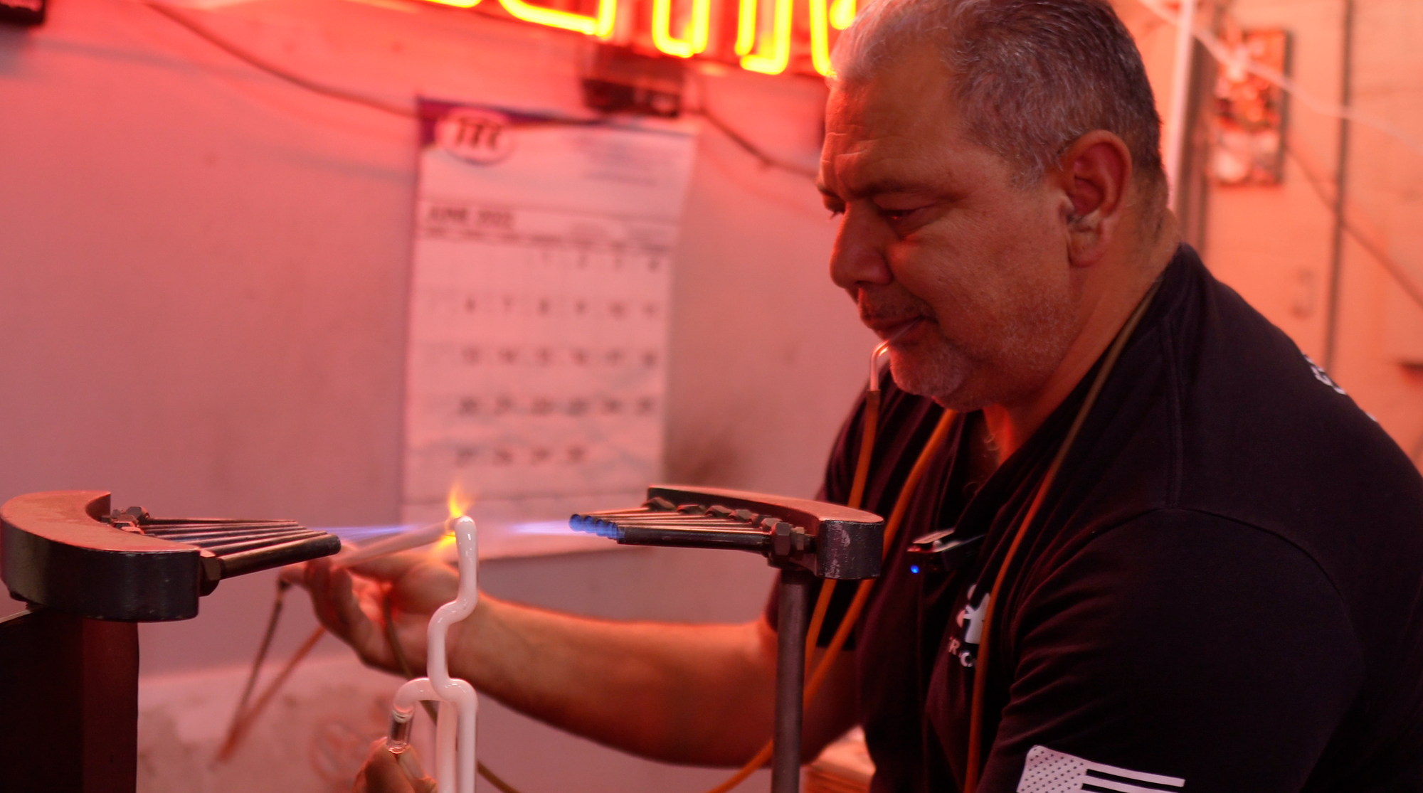 “You burn yourself a lot, your hands get burnt. You’re dealing with fire all the time,” Alvarado said. He burned himself several times while working on my piece. “For me it’s normal. Even if you’re a pro, you still burn yourself.” Every now and then, even for someone who has been doing this for decades, the glass tubes shatter: “You just gotta get another stick and do it again,” he said.